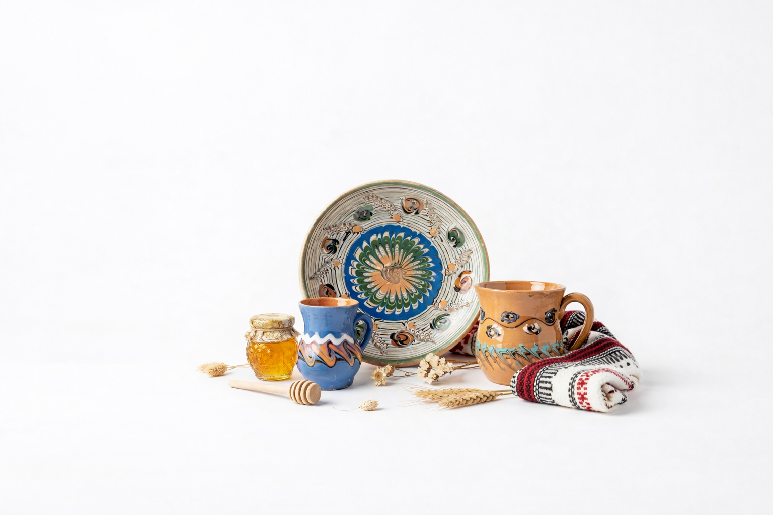 Bol ceramic de Horezu, 18 cm, lucrat manual, decor tradițional românesc, model floral spirală